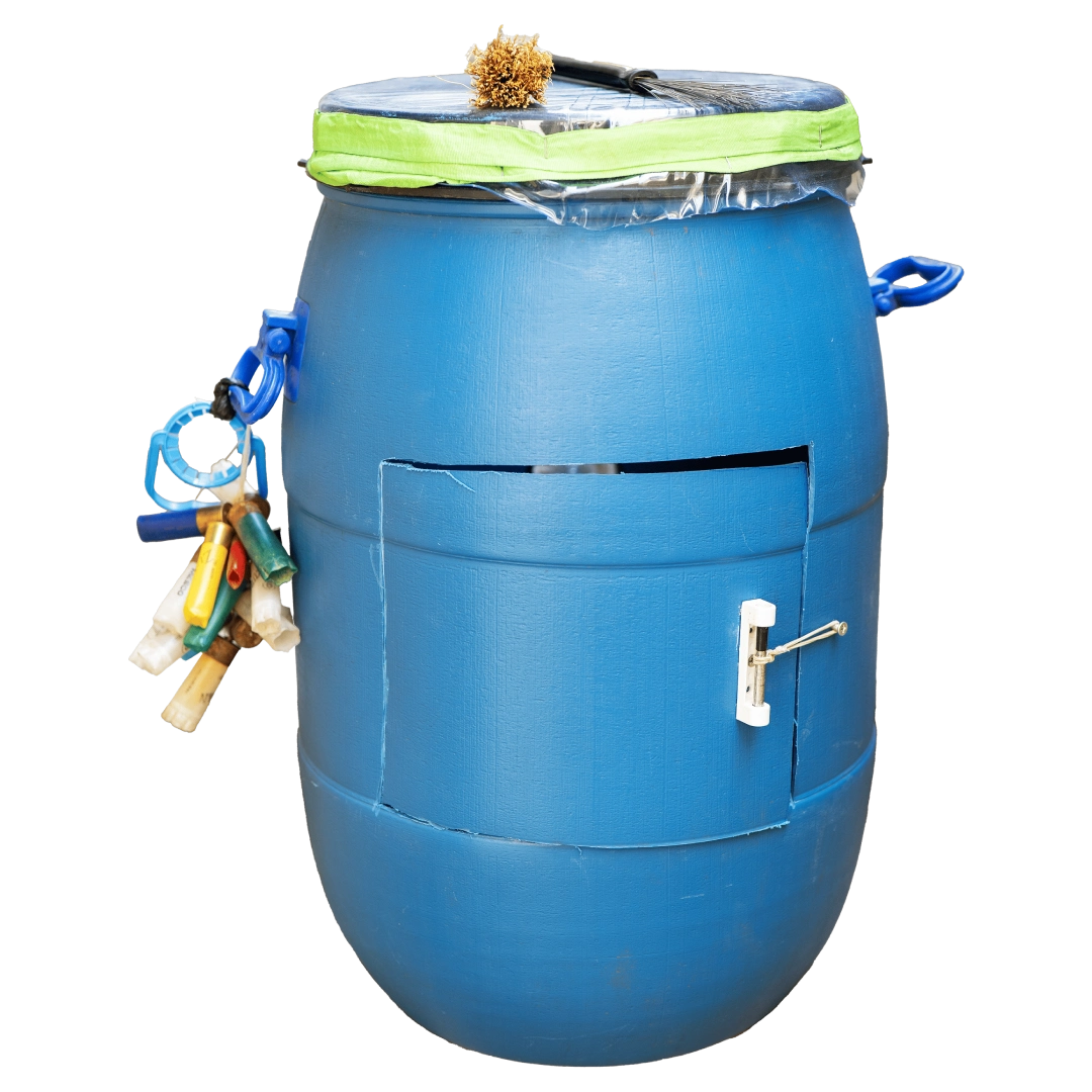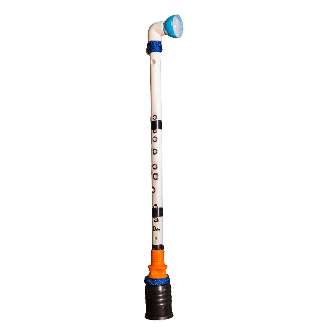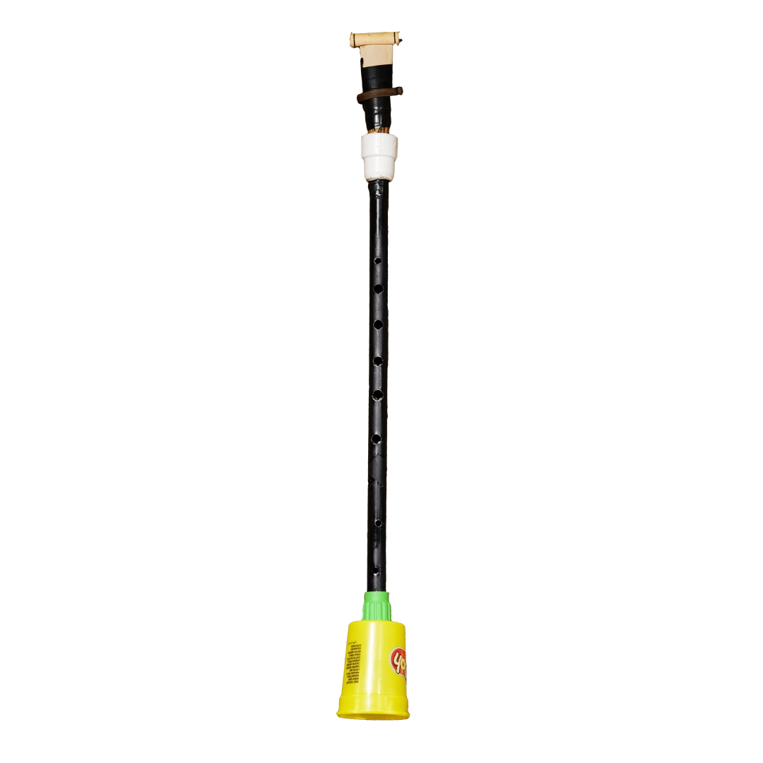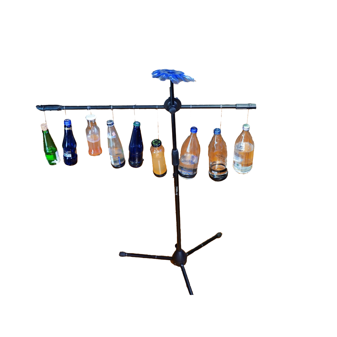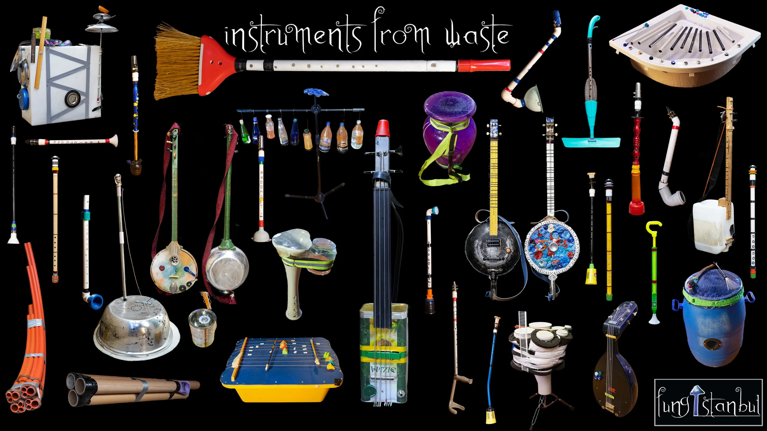 The instruments are created by processing various discarded materials such as plastic, metal, and wood.